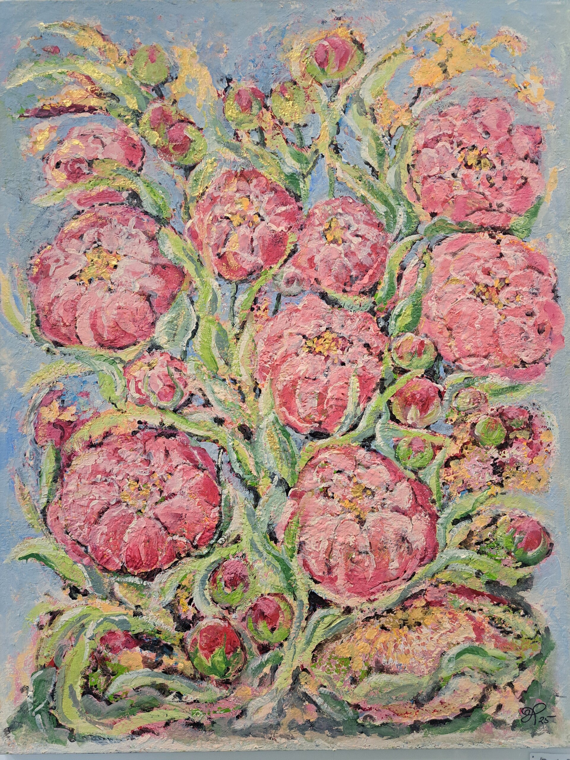 Pionit-roosan sävyisen maalauksen rosoinen tyyli muistuttaa ryijyä